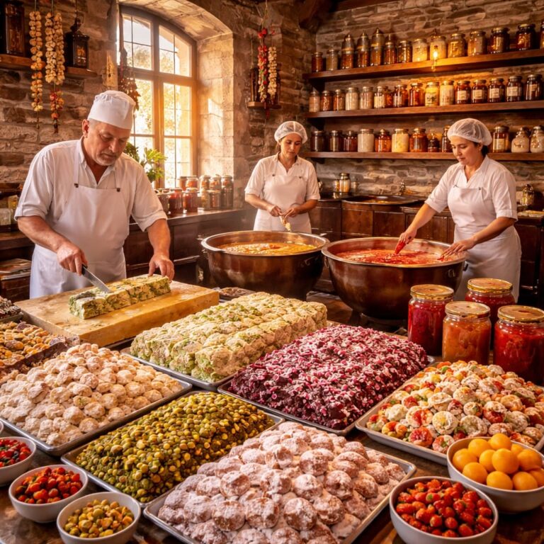 Visite de fabriques traditionnelles où vous découvrirez la production artisanale des loukoums et des confitures locales, avec possibilité de dégustation et d’achat.